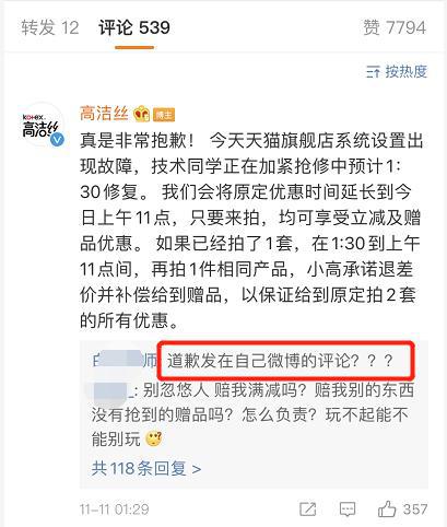 而高洁丝在11号的1点29分,在首条微博的评论中作出道歉称由于天猫旗舰店系统设置出现故障,技术同学正在加紧抢修中预计1:30修复。将原定优惠时间延长到今日上午11点,只要来拍,均可享受立减及赠品优惠。如果已经拍了1套,在1:30到上午11点间,再拍1件相同产品,小高承诺退差价并补偿给到赠品,以保证给到原定拍2套的所有优惠。但在微博评论中发布道歉声明,这波操作也是让人感到满满的敷衍。