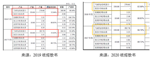 对比两版招股书发现,公司核心产品马破免疫球蛋白产能数据不一。新版招股书显示,2017年-2019年、2020年上半年,马破免疫球蛋白产能利用率分别为86.70%、82.00%、75.53%、67.15%,抗蛇毒血清产品产能利用率分别为89.72%、80.85%、86.04%、82.08%。在公司去年递交的招股书中显示,2017年、2018年公司马破免疫球蛋白产能均为520万支,产能利用率分别仅55.02%、52.04%,而非86.70%和82.00%。