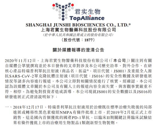 13日股市开盘前,君实生物在港交所发布澄清公告就此事作出回应,公司表示,关注到有关自媒体公众号撰写的文章对涉及本公司历史沿革、对外合作、在研核心产品特瑞普利单抗注射液及重组全人源抗SARS-CoV-2单克隆抗体注射液的安全性数据及研发进展情况等诸多内容进行报道。经确认,本公司认为该媒体文章关于本公司及有关人士的报道内容全面失实,与客观事实严重不符、相悖。