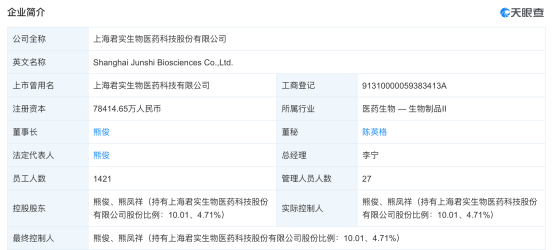 天眼查资料显示,君实生物成立于2012年12月,经营范围包括生物医药的研发,并提供相关的技术开发、技术咨询、技术转让、技术服务,从事货物及技术的进出口业务。药品批发,药品委托生产等。注册资本约7.8亿人民币,法定代表人为熊俊,公司第一大股东为HKSCC NOMINEES LIMITED,占股20.97%,法定代表人熊俊占股10.01%,为第二大股东。目前,该公司的专利信息有数十条,包括“抗PD-1抗体在制备治疗实体瘤的药物中的用途”、“抗IL-17A抗体及其应用”等。