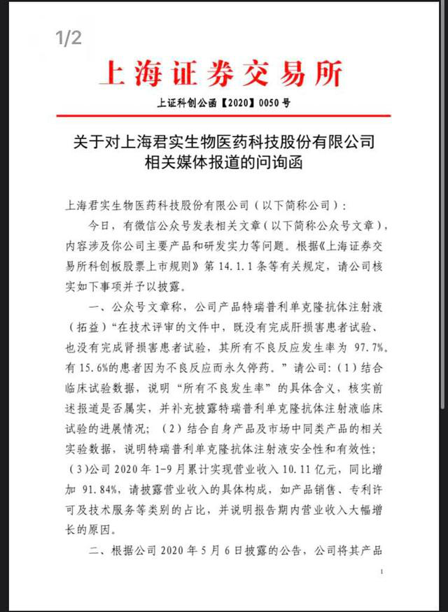晚间,君实生物收到了上海证券交易所问询函,要求公司就今日微信公众号相关文章涉及的问题,于11月19日之前作出说明。