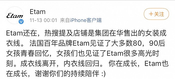 11月13日零点,Etam内衣在官方微博表示,“Etam还在”,并表示“成衣线离开,内衣线回归。”
