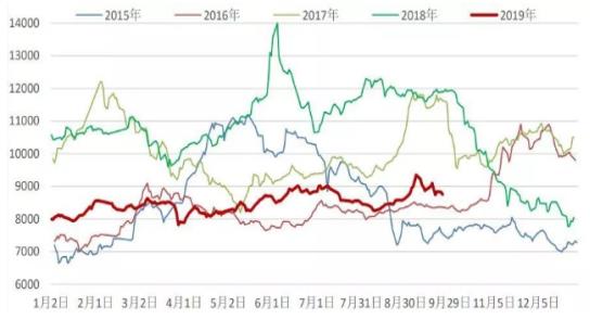 再次,从苯乙烯历史价格方面分析,由下图可知,苯乙烯价格波动的季节性特点并不明显,而且价格波动较剧烈。今年行情走势与2016年走势类似,四季度开始价格迅速拉涨,至12月初价格回调;2017年初再度强势上拉,至2月最高涨至12000元以上,随后价格由盛转衰,一路回落至8000元附近。当前华东苯乙烯现货价格约8300元/吨,价格处于历史中等偏低位置。但如果今年价格遵循往年运行轨迹,12月继续偏强运行的概率并不大,不过后期价格仍有望重回巅峰。