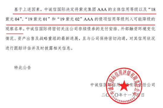 11月5日,中诚信国际决定将紫光集团AAA的主体信用等级以及18紫光04、19紫光01和19紫光02三只债券的AAA债项信用等级列入可能降级的观察名单。这让本就风雨飘摇的债券价格雪上加霜。