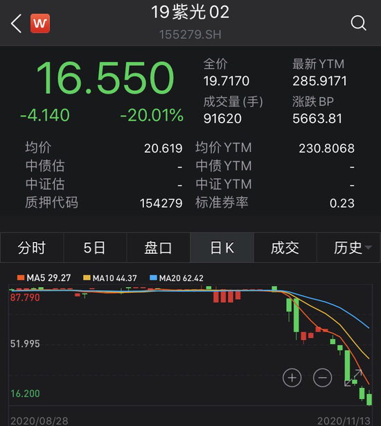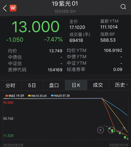 11月13日,19紫光01、19紫光02、18紫光04三只债券收盘分别下跌7.47%、20.01%和16.96%。
