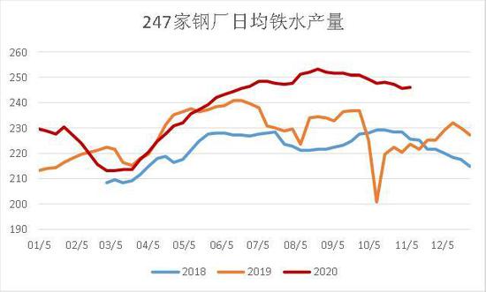 247家钢厂高炉开工率86.46%,环比上周降1.04%,同比去年同期增4.04%;日均铁水产量245.60万吨,环比降0.54万吨,同比增24.00万吨,需求端持续回落。