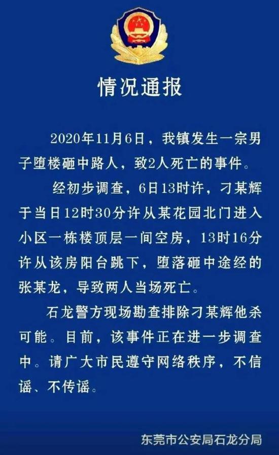 11月6日,东莞市公安局石龙分局发布情况通报称,当天石龙镇发生一宗男子堕楼砸中路人,致2人死亡的事件。