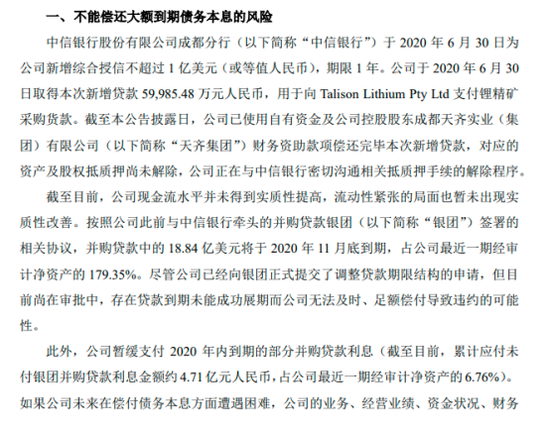 公告称,公司与中信银行牵头的并购贷款银团筹借的并购贷款中的18.84亿美元(约合人民币125.93亿元)将于今年11月底到期。尽管天齐锂业已经向银团提交了调整贷款期限的申请,但目前尚在审批中,存在贷款到期未能成功展期而公司无法及时、足额偿付导致违约的可能性。