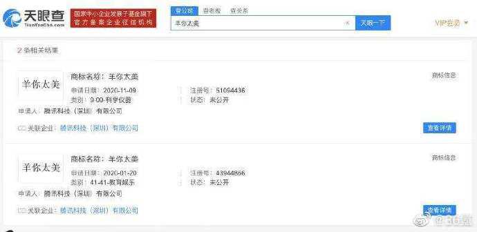腾讯注册“羊你太美”商标 涉及教育娱乐与科学仪器