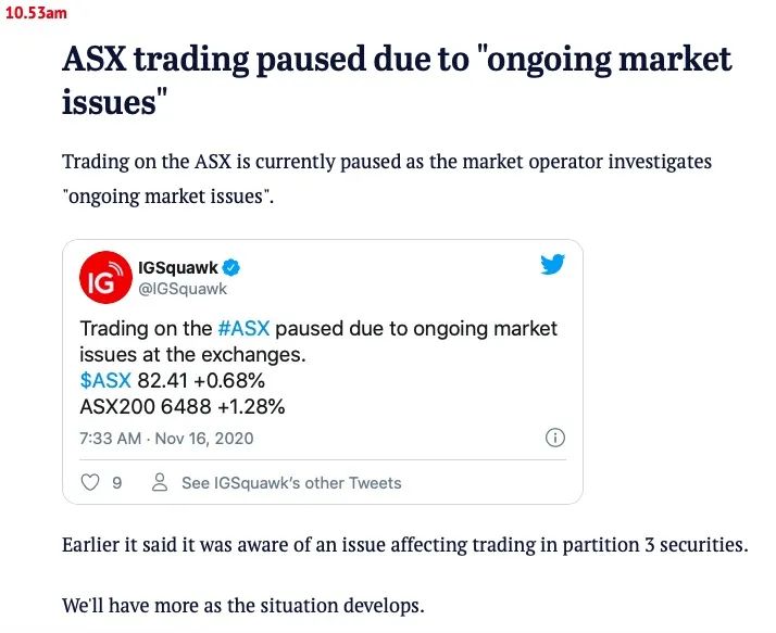 此前,澳交所也曾因交易故障,有过暂停交易。2016年,澳交所因技术故障延迟开市逾一小时。2011年,澳交所因技术故障暂停交易,影响15亿美元交易。