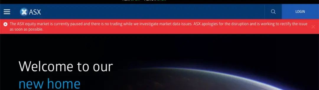 由于“市场数据问题”,在当地时间上午10:30左右(北京时间7:30),澳洲证券交易所宣布停止交易,并表示目前正在紧急调查中,将在30分钟内提供解决方案。澳交所在一条推文中称:“澳大利亚证券交易所对此事表示歉意,并正在努力尽快纠正这一问题。”