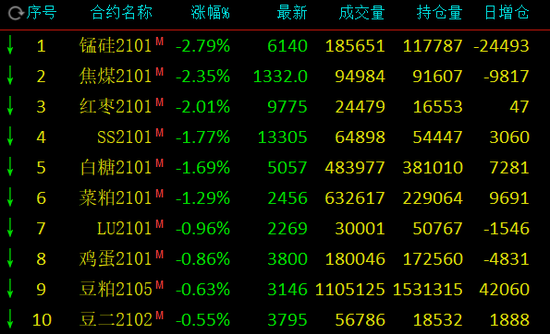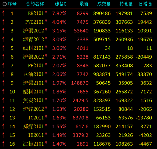 热点栏目11月16日,国内期市多数收涨,苯乙烯大涨近8%,PVC涨逾4%,沥青涨逾3%,沪银涨近3%,PP、豆油涨逾2%;有色普涨,沪铜涨逾3%,沪锡、沪锌涨近2%;跌幅方面,猛硅跌近3%,焦煤、红枣跌逾2%,白糖跌近2%。