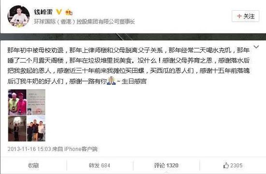 在钱峰雷早期的博文中看到,他从小生长在清贫的家庭中,早早的就立志要赚钱。