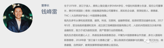 恒峰国际官网介绍,钱峰雷多年从事和投资贸易、建筑、科技、互联网、金融等领域,投资经营活动遍布全球。2017年5月,受当地政府邀请和支持,成立浙江恒峰国际控股有限公司,入驻杭州西湖区白沙泉并购金融街区,致力于成为股权投资、资产管理行业的领跑者。