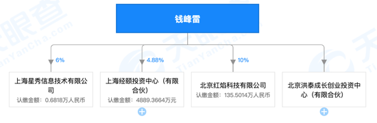 天眼查显示,钱峰雷为蚂蚁集团上海系的另一股东——上海经颐投资中心(有限合伙),截止2019年10月12日,钱峰雷持有该公司股份为4.88%。