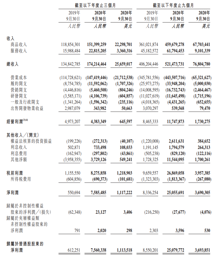 财报显示,第三季度公司收入为人民币1742亿元,同比增长29.2%。其中,日用百货商品销售收入为人民币581亿元,同比增长34.8%,服务收入为人民币228亿元,同比增长42.7%。