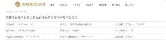11月16日,国开证券在北京金交所挂牌转让旗下9家证券营业部资产及相关权益,转让价格为7295.77万元,转让比例为100%,挂牌公告期为挂牌之日其20个工作日,项目截止日期为今年12月11日。