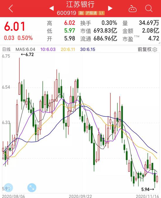 今年7月9日晚间,江苏银行披露配股方案。当日盘后江苏银行报收6.67元/股,但自7月1日以来的连续上涨,期间最高涨至近7元/股、已补回农历春节后疫情带来股价缺口。11月16日江苏银行盘后收6.01元/股,从配股方案发布到获监管核准区间跌幅10.83%;PB值为0.6025倍。
