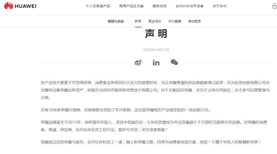11月17日上午,华为官网发布声明称,在产业技术要素不可持续获得、消费者业务受到巨大压力的艰难时刻,为让荣耀渠道和供应商能够得以延续,华为投资控股有限公司决定整体出售荣耀业务资产,收购方为深圳市智信新信息技术有限公司。对于交割后的荣耀,华为不占有任何股份,也不参与经营管理与决策。