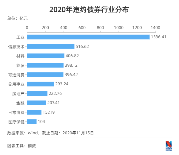 从行业来看,2020年违约金额排名中,前10名分别是工业1336.41亿元、信息技术516.62亿元、材料406.82亿元、能源398.12亿元、可选消费396.42亿元、公用事业293.24亿元、房地产222.76亿元、金融207.41亿元、日常消费157.19亿元、医疗保健104亿元。