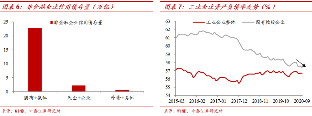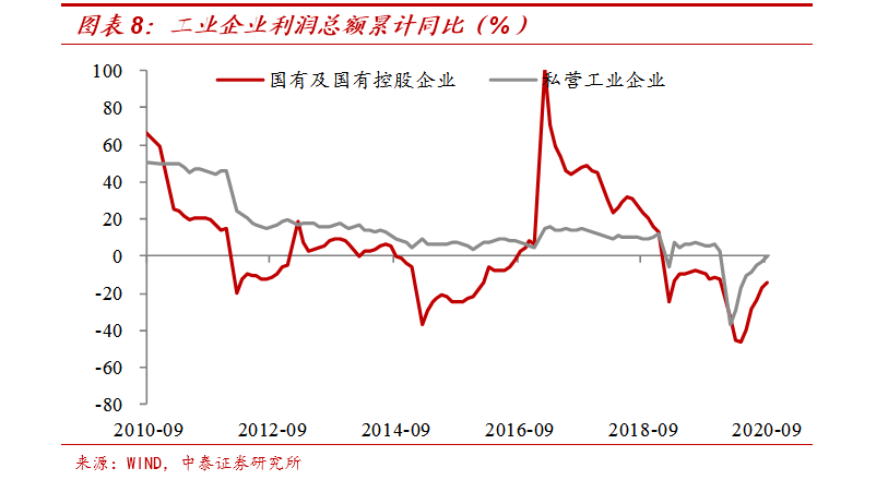 另一个重要原因,来自于国企本身的经营绩效偏弱,很难依靠自身业绩的增长来弥补现金流的短缺。2017-2018年国企利润大幅增长,主要受益于供给侧改革带来的上游产品大幅涨价,但2018年以后国有企业利润增速便再次回落,并持续低于民营企业。今年疫情发生以后,国企利润大幅下滑,截至9月份利润总额同比仍下滑14.3%,而民营企业的利润基本已经恢复至去年同期。