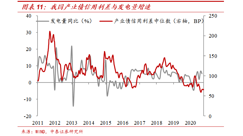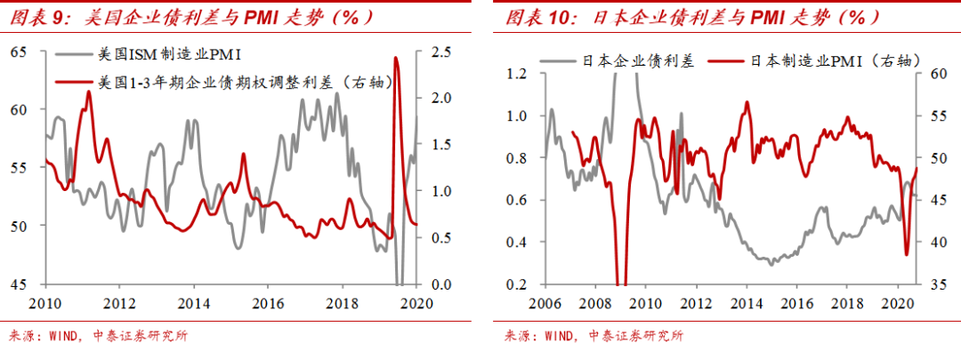 从美国和日本的经验来看,信用利差和经济基本面是负相关的。这也比较好理解,当经济比较差的时候,企业的违约风险就会比较高,适当地就应该给予更高的风险补偿,因此信用利差表现为走阔,反之则表现为收窄。