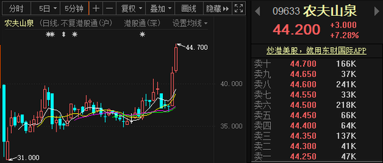 该赛道中的龙头企业农夫山泉自9月在香港上市后,股价屡创新高,现报44.2港元,市值近5000亿港元。中信证券分析师认为,农夫山泉正是抓住了大行业增速快的时机,获得了足够强的红利。其业绩的前提是在原本缺乏差异化的包装水行业,公司找到了树立异质性的突破点——水的来源细分。