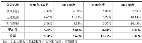报告期内,可比上市公司金风科技、运达股份、明阳智能研发费用率平均值分别为3.08%、3.76%、3.22%。
