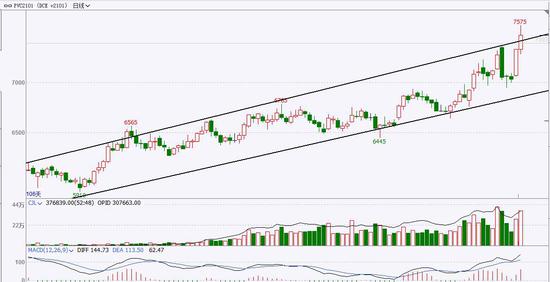 PVC基本面表现良好,货源供应偏紧,下游市场刚需稳定,社会库存持续回落。技术方面分析,PVC目前在上涨通道内运行良好,预计后期将继续上涨,但也要小心高位回调风险。