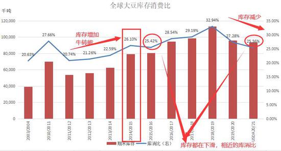 1、反例情况。当前是比价高位加上豆粕价格低位,比较类似的情况是11年和15-16年的情况。在11年和16年,类似情形后豆粕都出现了上涨。例外的是15年6月时的情形,当时的现货比价达到了1的高位,豆粕现货价格在2560一线。在比价回落的过程中,豆粕在低位震荡,在16年4月到了2300附近的价格才真正见底。15年是全球大豆库存消费比从牛市开始转熊市的第一年,是在一个库存消费比不断上升的过程中,也是价格从高往低走的周期之中。而现在是库存消费比连续两年下降,库存不断趋于紧张,更多可能是价格从低往高走的周期之中,现在和15年是不一样的情况。