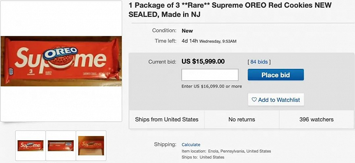 更夸张的还有和奥利奥联名的饼干,定价8美金,被炒到15999刀。