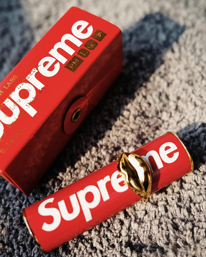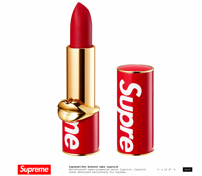 据了解,Supreme每周上新,门店都会有长龙队伍,且商品限量不补。如果消费者拼手速拼不过的话,就要拼钱了,产品溢价非常高。像Supreme与PatMcGrath Labs联名的一款口红,发售价是38美金,国内都炒到了1000多人民币一根口红。