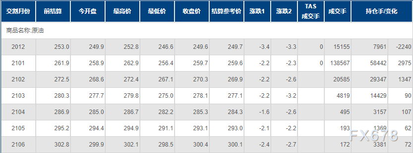 上海原油价格下跌,主力合约2101终盘收于259.7元/桶,跌2.2元/桶,跌幅0.84%。