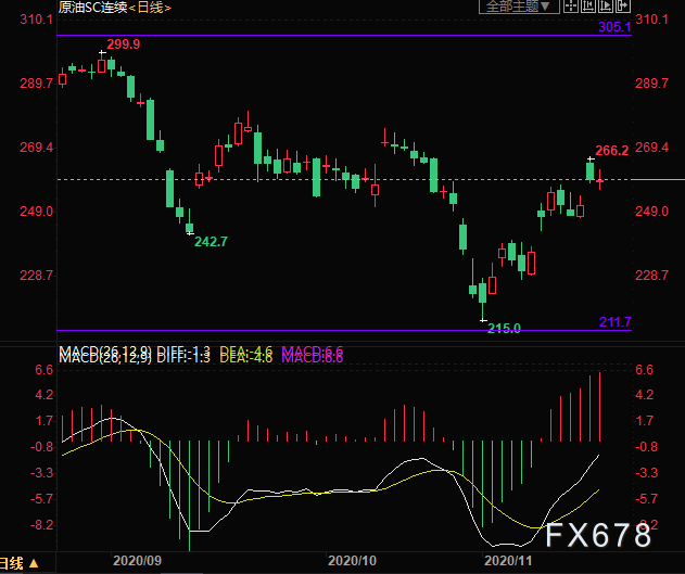 周三(11月18日)上海原油价格下跌,主力合约2101终盘收于259.7元/桶,跌2.2元/桶,跌幅0.84%。一方面,美国石油协会(API)北京时间周三凌晨公布的数据显示,上周美国原油库存增加,馏分油库存下降。截至11月13日当周,API原油库存增加427.7万桶,至约4.86亿桶,分析师预估为增加160万桶。另一方面,美国推动经济从新冠疫情中复苏的努力在短短数日就陷入了停顿,甚至是陷入倒退,因为新增感染人数正以疫情爆发初期以来最快的速度增长,这使得原油短线承压。不过,疫苗的消息和OPEC+可能推迟增产计划的消息仍在中线给油价提供支撑。