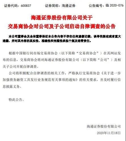 随后,海通证券公告回应称,公司将积极配合自律调查的相关工作,严格执行交易商协会《关于进一步加强债务融资工具发行业务规范有关事项的通知》的有关要求,并及时履行信息披露义务。