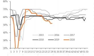 PP下游塑编开工率偏低,注塑及BOPP与往年持平,伴随国内外经济恢复,汽车家电产销逐步回升,快递及外卖保持快速增长,同时疫情警报尚未解除,医用防护用品带来结构性需求增量。往年塑编6月份需求进入淡季,8月份一般性环比改善,BOPP、注塑类需求虽季节性不够明显但夏季高温条件下整体上需求较前期弱势。一般来看,工业品具备“金九银十”需求季节性特征,作为工业品之一的聚烯烃需求在8月份可能整体仍偏弱,但从需求季节性规律来看,聚烯烃需求在8月份可能有逐步改善的预期,“金九银十”将至,且淡季也接近尾声,预计未来一至两周,开工率或有小幅回暖。