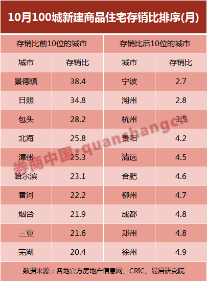 严跃进还指出,在10月份百城新建商品住宅存销比数值排名前10的城市中,包头、漳州、哈尔滨等城市位于偏高水平,其去库存周期或存销比分别为28.2、25.3和23.1个月。此类城市去库存周期超过了14个月的合理值水平,且比绝大多数城市要高,其属于应积极去库存的城市类型。