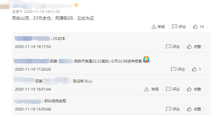 对于当日的大跌,有股吧网友表示:死在山顶,23元全仓,死撑到28……