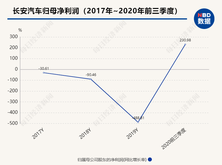 长安汽车今年以来业绩表现不俗。在此前的3年内连续出现净利润下滑,2019年更是同比下滑达488%,当年净利润亏损高达26亿元。此次的2020年三季报数据显示,前三季度公司实现营业收入558.42亿元,同比增长23.77%;净利润34.86亿元,同比增长230.98%。