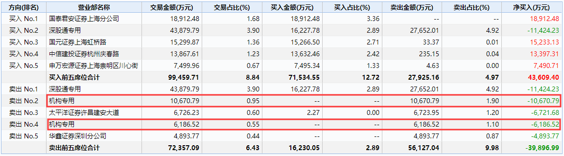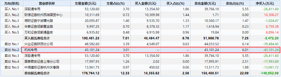 盘后数据显示,机构席位卖出4.3亿元,深股通席位虽买入1.34亿元,但同时卖出额更多,达3.98亿元,买入最多的席位全部为营业部席位。