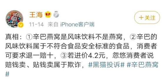 11月19日早间,职业打假人、微博认证为“知名法律博主、头条文章作者”的王海发布一份检测报告,并配文称:经过检测,@辛选官方微博 @辛有志xyz 当燕窝忽悠粉丝的风味饮料就是糖水。据检测结果,该产品蔗糖含量4.8%,而成分表里碳水化合物为5%,确认该产品就是糖水。