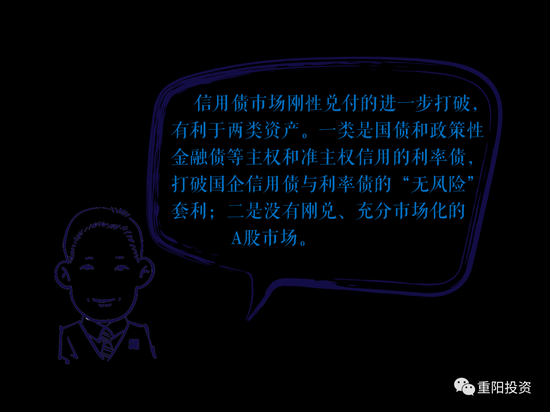 推动更多中长期资金流向A股市场。信用债市场刚性兑付的进一步打破,有利于两类资产。一类是国债和政策性金融债等主权和准主权信用的利率债,打破国企信用债与利率债的“无风险”套利;二是没有刚兑、充分市场化的A股市场。投资者将重新审视信用债市场的风险收益配比,通过对无风险的利率债和市场化相对高风险的权益资产进行哑铃配置,实现资产风险配置的再平衡。