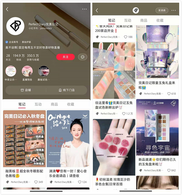 截止目前,完美日记在小红书相关笔记超过30万篇,粉丝量195万,获赞与收藏次数超过350万。