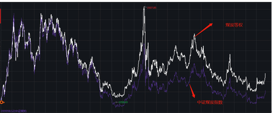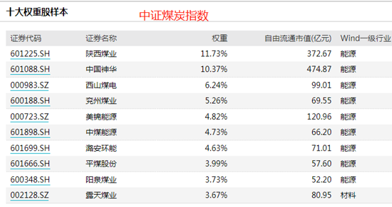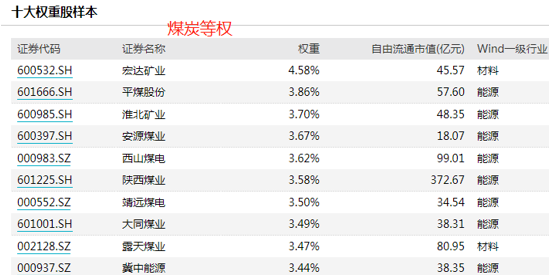 中证煤炭指数成分股中,大企业权重高,陕西煤业、中国神华等占权重超过10%;而煤炭等权指数中,中小企业占优势。