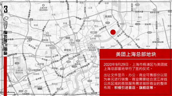 在拿下这块地前的 9 月 29 日,上海市杨浦区就已经跟美团公开签约,说美团将把上海总部设在这个地方。这块地的出让公告里也说得非常清楚,它是商业及商务用地,没有住宅;要积极地引入首店和旗舰店。也就是说,总部用地一定会有一个商业街区。
