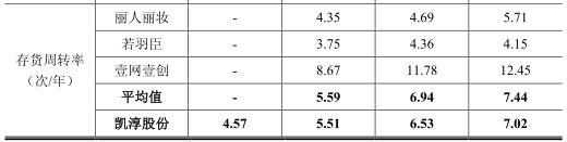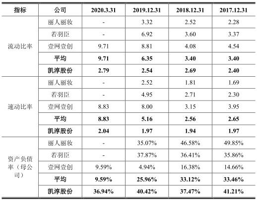 公司流动比率、速动比率低于同行业可比公司的平均水平。凯淳股份流动比率分别为2.40、2.69、2.54、2.79,速动比率分别为1.97、1.94、1.97、2.04。