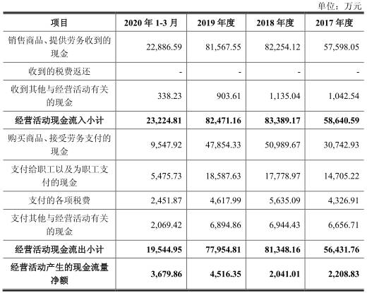 报告期内,公司经营活动产生的现金流量净额分别为2208.83万元、2041.01万元、4516.35万元、3679.86万元。其中,销售商品、提供劳务收到的现金分别为5.76亿元、8.23亿元、8.16亿元、2.29亿元。