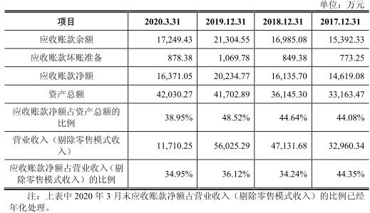 2017年至2020年3月31日,凯淳股份应收账款余额分别为1.54亿元、1.70亿元、2.13亿元、1.72亿元,应收账款净额分别为1.46亿元、1.61亿元、2.02亿元、1.64亿元,占资产总额的比例分别为44.08%、44.64%、48.52%、38.95%。
