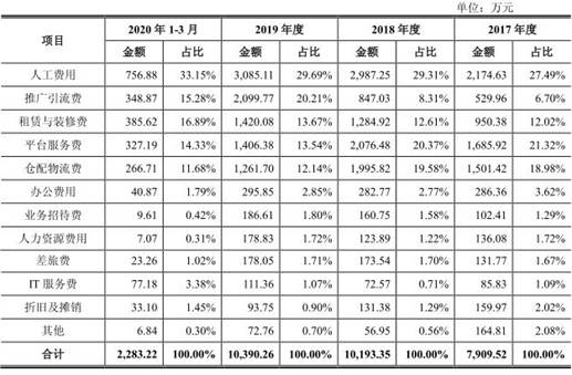 其中,人工费用分别为2174.63万元、2987.25万元、3085.11万元、756.88万元,占销售费用的比例分别为27.49%、29.31%%、29.69%、33.15%;推广引流费分别为529.96万元、847.03万元、2099.77万元、348.87万元,占销售费用的比例分别为6.70%、8.31%、20.21%、15.28%。