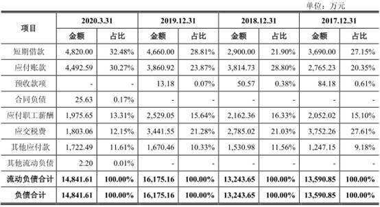 2017年至2020年3月31日,公司总资产分别为3.32亿元、3.61亿元、4.17亿元、4.20亿元,总负债分别为1.36亿元、1.32亿元、1.62亿元、1.48亿元。资产负债率分别为41.21%、37.47%、40.42%和36.94%,高于同行业可比公司资产负债率分别为33.46%、33.12%、25.96%、9.59%。